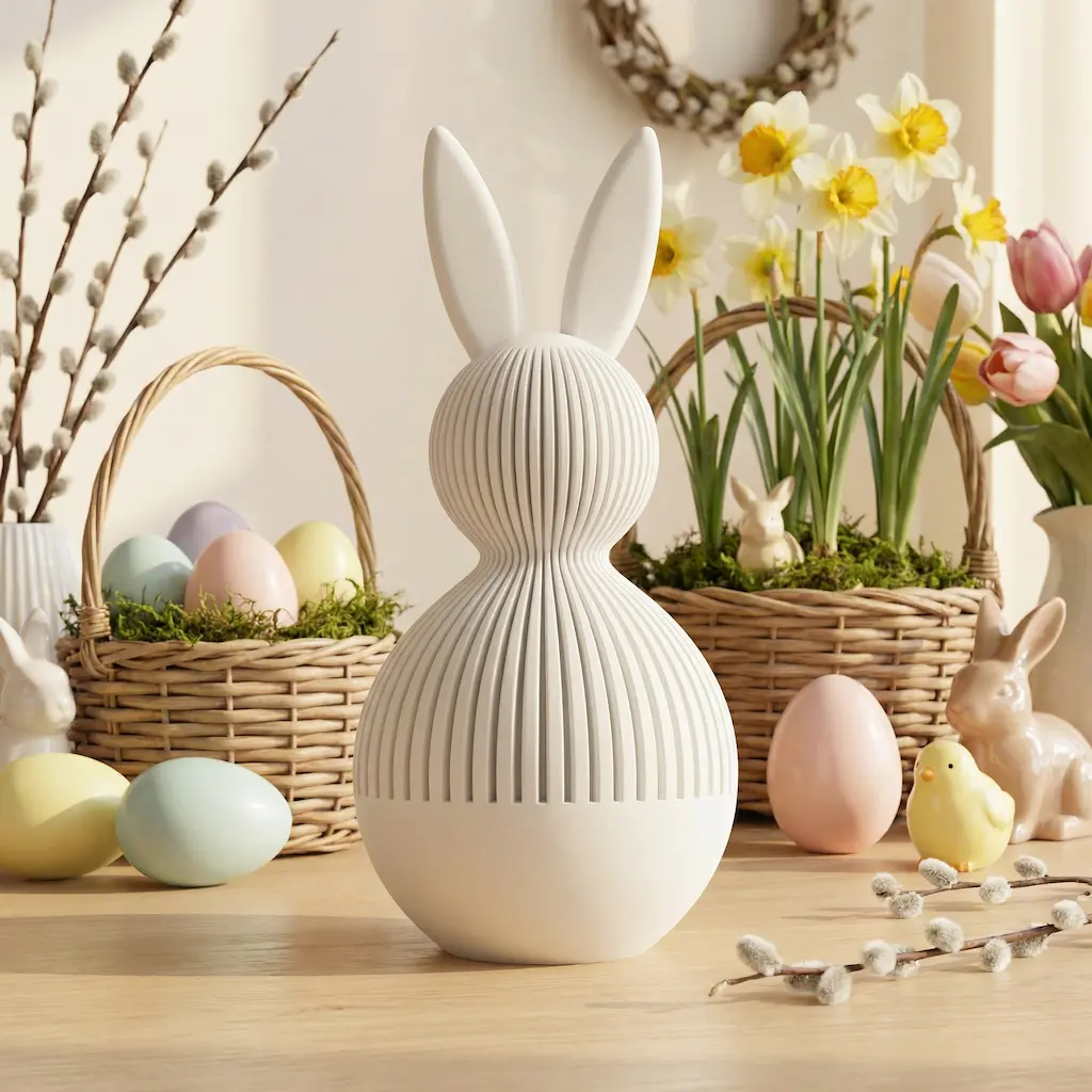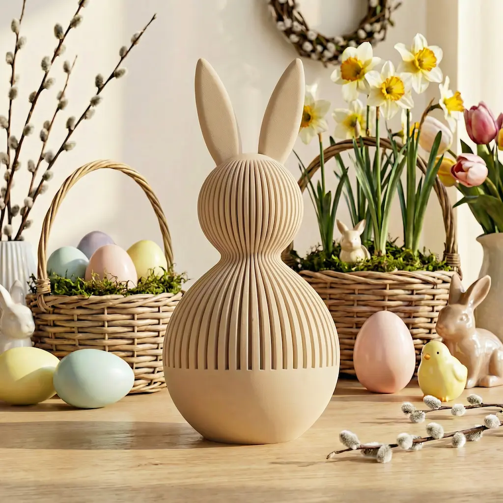 Minimalistisches Design mit feiner Linienstruktur und verborgenem Stauraum – ideal für eine elegante Osterdekoration.